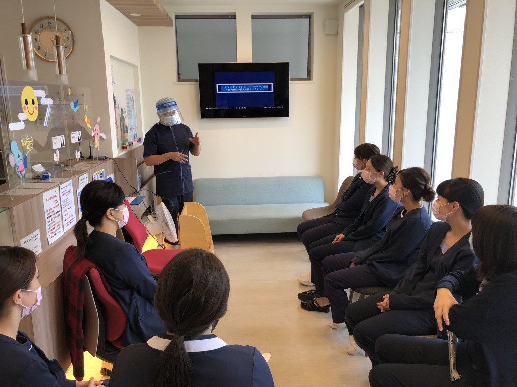 そこで今回は院長による安全管理・感染対策に対するレクチャーをしてもらいました。もちろん、換気を十分にしてマスクを着用、院長はフェイスシールド着用です!